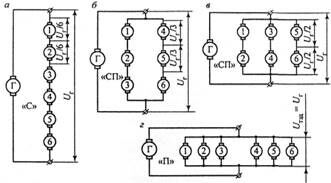 а — последовательное (С), б и в — последовательно-параллельное (СП), г — параллельное (П)