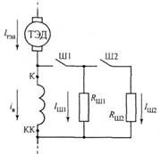 На тепловозах регулирование магнитного потока ТЭД осуществляют шунтированием его обмотки возбуждения. Параллельно последовательно включенной обмотке возбуждения К-КК тягового электродвигателя ТЭД (рис. 60) подключают несколько (на тепловозах два) резисторов Rш1, Rш2. При включении контактора Ш1 часть тока якоря двигателя Iтэд отводится от обмотки возбуждения в цепь, образуемую резистором Rш1. Магнитный поток полюсов тягового двигателя уменьшается. Включение с помощью контактора Ш2 второго резистора Rш2 (второй ступени ослабления) еще больше уменьшит магнитный поток. На тепловозах ограничиваются двумя ступенями ослабления магнитного потока. Коэффициент ослабления магнитного потока α одной ступени регулирования: α = Rш/( Rш + Rв).