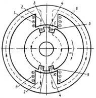 1 — обмотка возбуждения; 2 — сердечник полюса; 3 — воздушный зазор; 4 — сердечник якоря; 5 — обмотка якоря; 6 — остов (станина) генератора