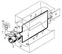 1 — рамка (виток); 2 — контактные кольца; 3 — щетки; С, Ю — постоянные магниты; Д — двигатель