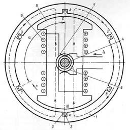 На электрических схемах направления движения тока по обмоткам катушек принято обозначать специальными символами: × — движение от нас; • — к нам. Таким образом, катушка, обтекаемая током, вместе с сердечником полюса представляют собою искусственный электрический магнит, который можно при необходимости включить в работу или выключить, предварительно обесточив обмотку возбуждения.