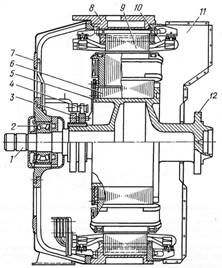 Основными узлами двигателя ЭД-118А являются (рис. 57) неподвижный остов 5, закрытый подшипниковыми щитами 1,12, и вращающийся якорь 9 с обмотками 8, соединенный с помощью тягового редуктора с колесной парой тепловоза.