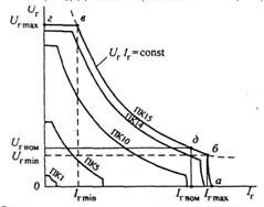 Из формулы следует, что, например, снижение частоты вращения якоря nтэд приведет к увеличению значения тока нагрузки I двигателя и, соответственно, тягового генератора Ir. Благодаря гиперболической форме внешней характеристики тягового генератора в этом случае пропорционально увеличению тока нагрузки уменьшится его напряжение Ur. Таким образом, изменение скорости движения тепловоза с электрической передачей автоматически приводит к регулированию напряжения Ur и Uтэд.