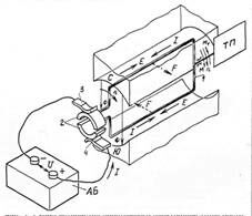 1 — рамка (виток); 2 — контактные кольца; 3 — щетки; С, Ю — постоянные магниты; АБ — аккумуляторная батарея; ТП — тяговый привод