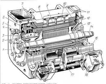 1 — передний подшипниковый щит; 2 — коллекторная пластина; 3 — нажимной конус; 4 — щеткодержатель со щетками; 5 — остов; 6 — корпус коллектора; 7 — передняя нажимная шайба; 8 — обмотка якоря; 9 — сердечник якоря; 10 — сердечник и катушка возбуждения главного корпуса; 11 —защитный козырек; 12 — задний подшипниковый щит; 13 — задняя нажимная шайба; 14 — вал якоря; 15 — моторно-осевой подшипник; 16 — крышка моторно-осевого подшипника; 17— добавочный полюс