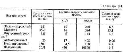 Средние скорости и сроки доставки, рассчитанные в соответ­ствии со средней дальностью перевозки грузов по видам транс­порта, представлены в табл. 9.4. Приведенные в таблице сроки доставки грузов рассчитаны в пределах "осредненных" сфер дей­ствия видов транспорта и не вполне сопоставимы. Для потреби­телей более важен показатель средней скорости доставки, кото­рый позволяет рассчитывать "свой" срок доставки груза на кон­кретном расстоянии перевозок.