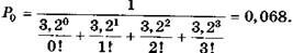 Пример 1. Фирма имеет n=4 телефонных диспетчеров. Среднее число вызовов в течение часа составляет λ=96. Среднее время телефонного разговора То6 = 2 минуты. Определить степень загрузки диспетчеров и вероятность отказа в обслуживании.