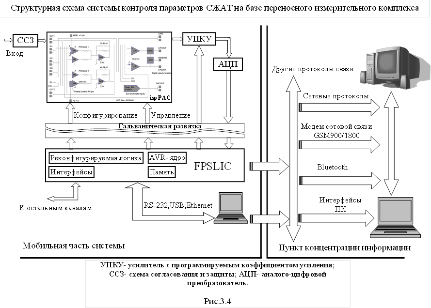 С одного из выходов ispPAC аналоговый сигнал подается на программируемый усилитель (УПКУ), а затем в АЦП. Цифровой эквивалент результата измерений поступает в FPSLIC, куда собирается информация и со всех остальных каналов. Идентификация состояния объекта диагноза в случае распределенной сети передачи данных [69,70] осуществляется либо в пункте концентрации информации, либо в переносном ПК типа Notebook, находящемся на незначительном удалении (до 100м) от ОД. Возможно подключение измерительного контроллера к компьютеру при помощи интерфейса USB [71].