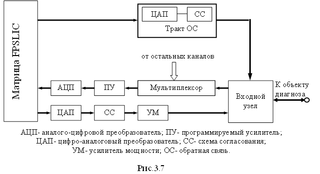 Структурная схема одного из каналов представлена на рис.3.7. В целях самодиагностики и обеспечения высокой точности измерений при выходе из нормы параметров передаточных характеристик измерительных каналов, введен тракт обратной связи. Это позволяет определить неисправность в измерительном канале и многократно сократить погрешность измерений при искажениях его передаточной характеристики вследствие нагрева, изменениях параметров элементов и т.п. Таким образом, значительно снижаются требования ко всему измерительному тракту и, как следствие, его стоимость при тех же показателях точности канала в целом.