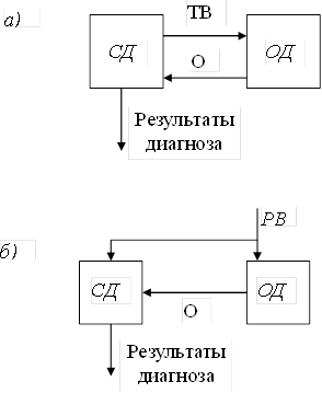 Система тестового диагноза предусматривает взаимодействие между средствами диагноза СД и объектом диагноза ОД (рис.2.2.а). Тестовые воздействия ТВ на ОД поступают только от СД. Поэтому как состав, так и последовательность подачи этих воздействий можно выбирать исходя из условий эффективности организации процесса диагноза. При этом каждое очередное воздействие можно назначать в зависимости от ответов О объекта на предыдущие воздействия. Воздействия в такой системе называют тестовыми.
