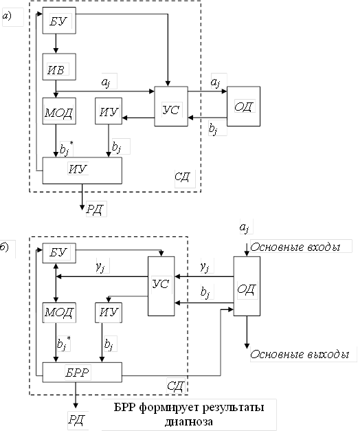 В функциональной схеме системы функционального диагноза (рис.2.3.б) рабочие воздействия aj поступают на основные входы объекта ОД, с которого снимаются сигналы yj управления средствами УС диагноза и сигналы bj ответов ОД на воздействия aj. Сигналы yj управляют блоками БУ и МОД в зависимости от режима работы объекта, при этом на входы МОД поступают воздействия aj. Между блоками БРР и ОД устанавливается прямая связь, если на систему диагноза возлагается защита объекта управления от неправильного воздействия со стороны ОД при его повреждениях.