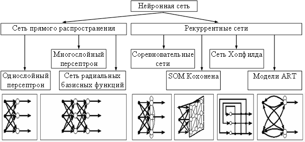 Перспективным направлением для развития отвечающим этим требованиям СТД, является использование теории искусственных нейронных сетей (ИНС) и метода группового учета аргументов МГУА [34]. Анализ архитектур различных нейронных сетей и алгоритмов, применение которых целесообразно в системах диагностики и контроля СЖАТ, позволяет разбить их на следующие категории (рис.2.4).