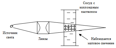 Через чистые жидкости и молекулярные растворы свет просто проходит. Через коллоидно-дисперсные системы с размером частиц 10-7-10-9 см луч света, встречая на своем пути частицу, не отражается, как бы огибает ее, отклоняется и несколько изменяет свое направление (дифракция).