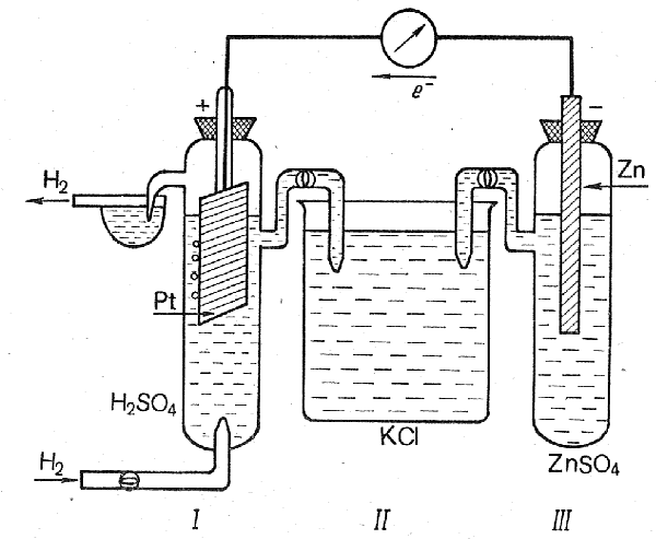 I – водородный электрод, II – солевой мостик, III – измеряемый электрод.