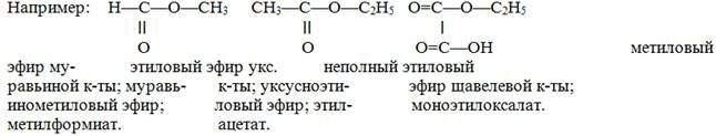 Названия сложных эфиров обычно производят от наименований образующих их спирта и кислоты. Часто употребляют также названия, которые выводят из наименования углеводородного радикала спирта и корня латинского наименования кислоты (или, что тоже, корня названия радикала этой кислоты) с добавлением к последнему окончания – ат.