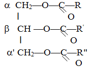 В большинстве случаев в состав жиров входят полные эфиры глицерина, образовавшиеся в результате этерификации всех трех его гидроксильных групп и называемые триглицеридами, поэтому строение жиров может быть выражено следующей общей формулой:
