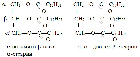 В качестве примеров смешанных триглецеридов приведем пальмитоолеостеарин, содержащий остатки пальмитиновой, олеиновой и стеариновой кислот, и диолеостеарин с двумя остатками олеиновой и одним остатком стеариновой кислот: