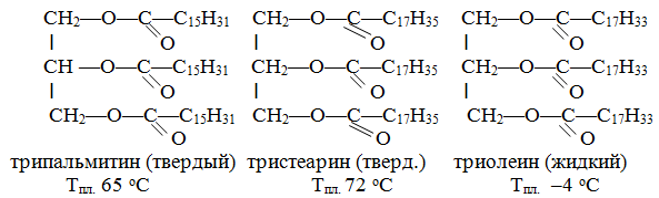 Жиры практически не растворимы в воде, но хорошо растворимы в спирте, эфире и в других органических растворителях. Температуры плавления жиров зависит от того, какие кислоты участвуют в образовании входящих в их состав глицеридов. Жиры, содержащие преимущественно остатки предельных кислот, имеют наиболее высокие Тпл. и представляют собой твердые или мазеобразные вещества, жиры же, в составе которых содержатся остатки главным образом непредельных кислот – жидкости с более низкими температурами плавления. Так, трипальмитин и тристеарин – твердые вещества, а триолеин – жидкость с Тпл. –40С.