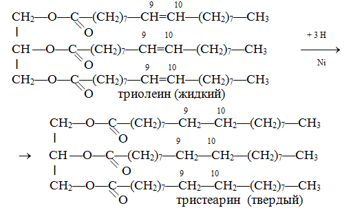 Жидкие жиры и масла путем каталитического присоединения водорода по месту двойных связей входящих в их состав непредельных кислот могут быть превращены в твердые жиры. Это метод называют гидрогенизацией (отверждением) жиров. Впервые он был разработан в 1906г. русским ученым С.А. Фокиным, а в 1909г. им же осуществлен в промышленном масштабе.