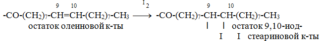 Окрашенные в бурый цвет растворы иода и брома обесцвечиваются при взаимодействии с входящими в состав жиров непредельными кислотами в результате присоединения галогенов по двойным связям. Например: