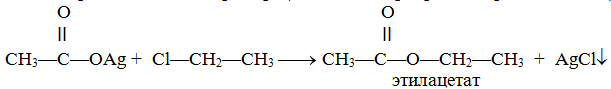 Сложные эфиры могут быть получены из солей кислот при действии на них галогенпроизводных. Например: (из ацетата серебра и хлористого этила)