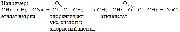 Аналогичный предыдущему метод получения сложных эфиров заключается в действии спиртов или алкоголятов на галогенангидриды кислот.