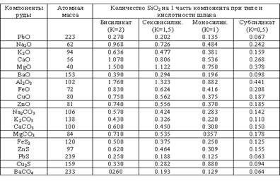 Для облегчения расчетов в таблице 1 приведены эквивалентные соотношения количеств SiO2, приходящихся на 1 г оксидов металлов, карбонатов и сульфидов при различном типе и кислотности шлаков.