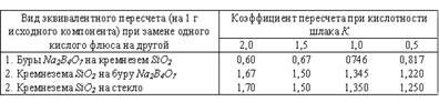 При недостатке SiO2 в навеске дефицитное его количество восполняется введением кислого флюса (буры или стекла). При этом количество вводимой буры не должно превышать 15-20 г при навеске 50 г и 25-35 г при навеске 100 г. Если же требуется кислого флюса больше указанных норм загрузки буры, остальное недостающее количество SiO2 заменяется тонко измельченным стеклом. При расчете добавок кислых флюсов для шлаков с различной кислотностью рекомендуется пользоваться эквивалентами замены различных видов этих флюсов друг на друга, приведенные в таблице  3.