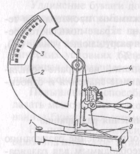 1 – установочный винт;2 – маятник; 3 –шкала; 4 – стрелка; 5, 7 – зажим; 6 – нож; 8 – станина; 9 - тормоз