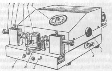 Рис. 172 - Аппарат И-1-2: 1 – патроны со спиральными патронами внутри; 2 – колонки; 3 – штифты; 4 – зажимы; 5 – приспособление со стальной пластиной, имеющей вертикальную прорезь; 6 – счетчик числа оборотов; 7 –ручка поворота механизма;  8 – выключатель;  9 – рычаг включения;  10 – подставка; 11 – станина