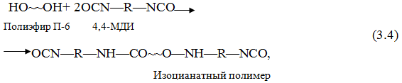 В результате реакции (3.1) происходит соединение (удлинение) молекул олигоэфира через уретановые группы в длинные макромолекулы, благодаря чему по мере протекания этой реакции возрастает вязкость реакционной смеси вплоть до потери текучести. В результате реакции (3.2) смесь одновременно вспенивается выделяющимся диоксидом углерода.