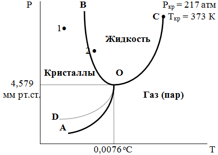 Линия ОА отвечает равновесному сосуществованию твердой и газообразной фаз (кривая возгонки), линия ОВ - твердой и жидкой фаз (кривая плавления), линия ОС - жидкой и газообразной фаз (кривая кипения или испарения; заканчивается критической точкой). Линия OD показывает, как меняется давление пара над переохлажденной водой.