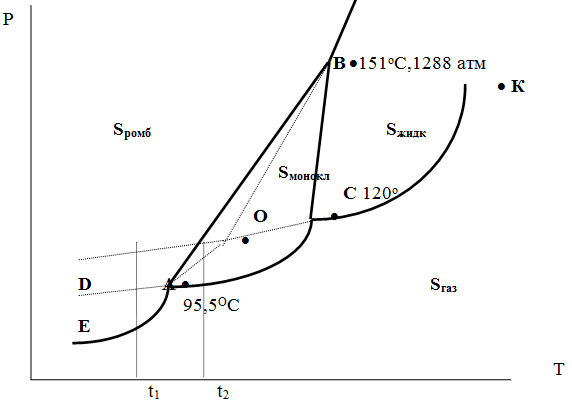 Кристаллическая сера может существовать в двух модификациях - ромбической и моноклинической. Þ S образует 4 фазы : две кристаллические, жидкую и пар; соответственно на диаграмме состояния - 4 области. Линии на диаграмме отвечают условиям, при которых возможно равновесное сосуществование двух фаз; три тройные точки : А, В, С.