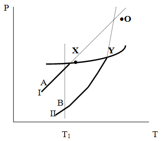 Бывают случаи, когда кривые давления паров двух кристаллических модификаций (например, бензофенона) должны пересечься выше кривой давления пара над жидкой фазой. Обе модификации плавятся в точках Х и Y; Р пара модификации I во всей области существования кристаллов выше Р пара модификации II, а следовательно, самопроизвольные превращения возможны лишь в направлении