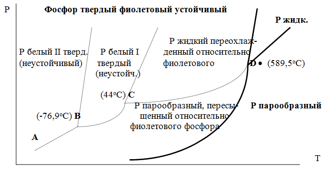 Пунктиром обозначены кривые давления паров неустойчивых фаз. Т. D соответствует устойчивому сосуществованию жидкого фосфора, твердого фиолетового фосфора и парообразного фосфора. Точки В и С соответствуют неустойчивому сосуществованию трех фаз : т. В - двух модификаций белого фосфора и пара, т. С - белого фосфора I, переохлажденного жидкого фосфора и пара.