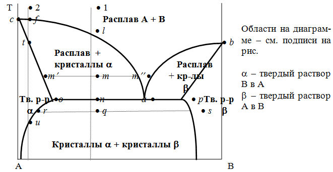 По достижении Т, которой отвечает т. n , система состоит из жидкого раствора а и твердого раствора о . Жидкий раствор а может находиться в равновесии одновременно с двумя твердыми растворами о и р ; он называется жидкой эвтектической смесью. При дальнейшем отнятии теплоты из эвтектической смеси выделяются два твердых раствора о и р . Во время кристаллизации эвтектики имеются три фазы : расплав а , кристаллы р и кристаллы о . После окончания кристаллизации остаются две кристаллические фазы, каждая из которых представляет твердый раствор.