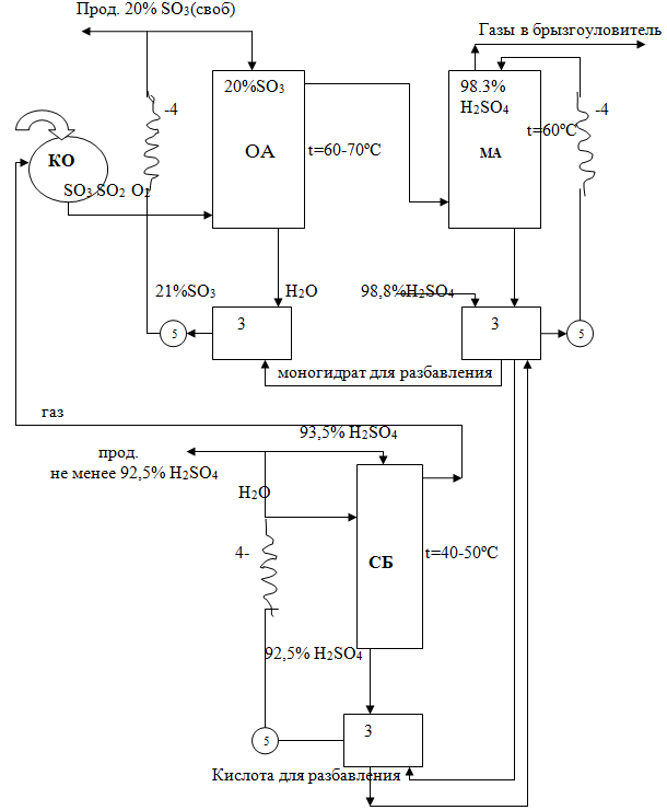 Выход олеума – доля продукта получаемого в виде олеума. Выход олеума тем больше, чем меньше паров воды и больше SO3 содержится в газе.Как в скрубберах с насадкой – башнях орошаемых серной кислотой, так и аппаратах барботажного типа, где газ проходит через слой кислоты, серная кислота поглощает из газовой смеси только SO3, остальная часть газа пройдя абсорберы удаляется в атмосферу.