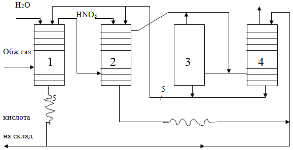 В башне 3 окись азота окисляется кислородом содержащимся в газе. Из окислительной башни газ поступает в башню 4, где окислы азота поглощаются орошающий её серной кислотой, эту башню называют абсорбционной.
