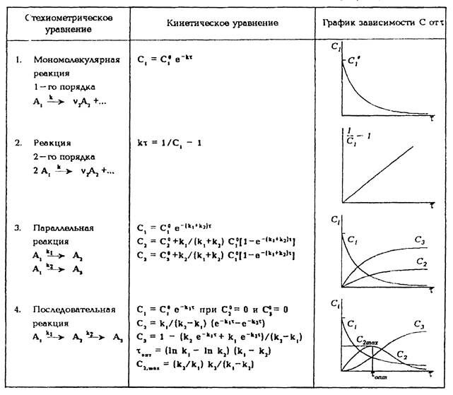 В табл. 4 приведены кинетические и графические зависимости концентраций С{ от времени для некоторых необратимых простых и сложных реакций, осуществляемых в реакторах интегрального тина.