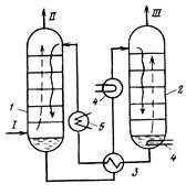 1 – абсорбер; 2 – десорбер; 3 – теплообменник; 4 – подогреватель; 5 – холодильник; I – исходный (жирный) газ; II, III – легкие и тяжелые компоненты газа.