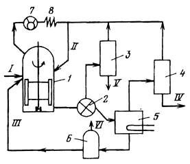 Сырьем такого процесса служит каталитически ароматизированная бензиновая фракция, от которой в тарельчатом экстракторе 1 водным раствором диэтиленгликоля (ДЭГ) экстрагируются ароматические соединения С6 – С8. Раствор экстракта подвергают регенерации с отделением сверху колонны 3 ароматических углеводородов VI, а рафинатный (деароматизованный) раствор отмывают от ДЭГ водой в реэкстракторе 2.