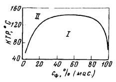 I – область существования двухфазной системы; II – область полной взаимной (однофазной системы)