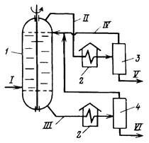 1 - роторный дисковой контактор (экстрактор); 2 - печи; 3, 4 - блоки отгонки растворителя; I - исходный масляный дистиллят; II, III - рафинатный и экстрактный растворы; IV - регенерированный растворитель; V - очищенный масляный дистиллят; VI – экстракт