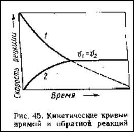 Скорость прямой реакции уменьшается по мере расходования реагентов, скорость обратной реакции при этом увеличивается. Таки образом: