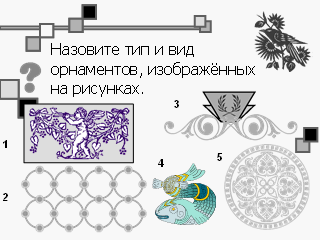 - Какие виды орнаментов (классификация по виду изобразительного мотива) вы знаете?