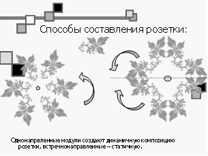 Подготовьте шаблон модуля. Разработайте все возможные варианты симметричных построений орнамента с использованием растительного мотива по схеме.