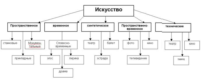 Искусство можно классифицировать по разным основаниям, следуя различным принципам классификации. Рассматривая материальное бытие художественной формы, различают искусство пространственные (живопись, графика, скульптура, декоративное искусство, архитектура), временные (музыка, словесное искусство) и синтетические, пространственно-временные (театр, кино, танец), технические (кино, фотография, телевидение)