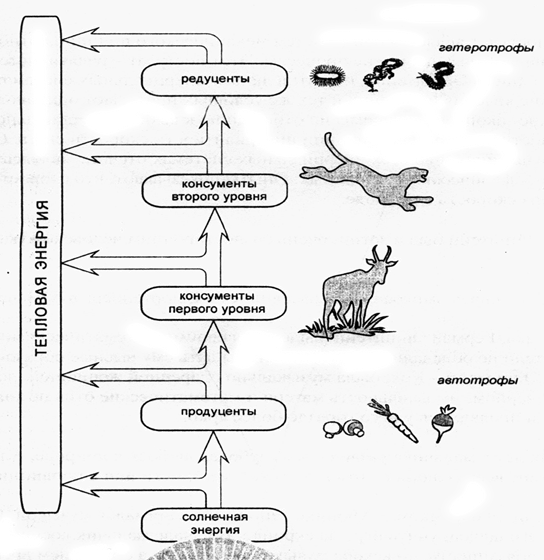 Далее по трофическим (пищевым) цепям органическое вещество и энергия от автотрофов (продуцентов) передаются гетеротрофам (консументам, редуцентам).