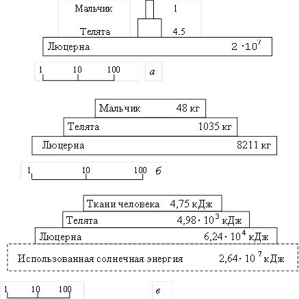растений. В пирамиде биомасс (б) число особей заменено их биомассой. В пирамиде энергии (в) учтена солнечная энергия. Люцерна использует 0,24 % солнечной энергии. Для накопления продукции телятами в течение года используется 8 % энергии, аккумулированной люцерной. На развитие и рост ребенка в течение года используется 0,7% энергии, аккумулированной телятами. В результате чуть более одной миллионной доли солнечной энергии, падающей на поле в 4 га, используется для ребенка в течение одного года.