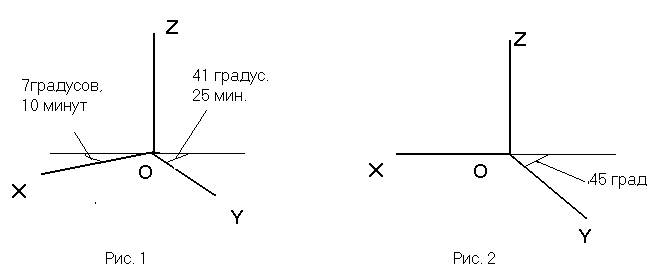 Для пространственных схем чаще всего ангажируется система координат прямоугольной диметрической проекции, рис. 1, реже – косоугольной диметрической проекции, рис. 2